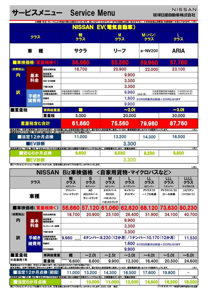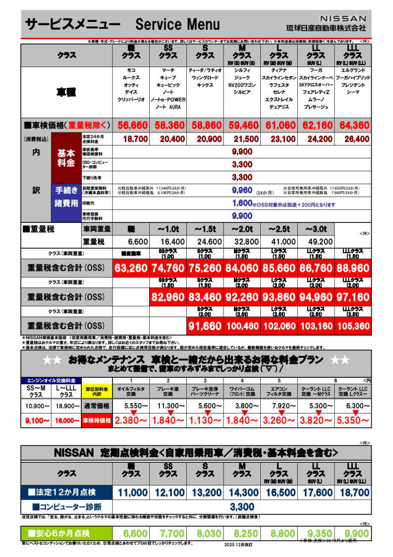 法定24ヶ月定期点検:クルマの基本性能や環境保全に関する状態をチェックするため、法律で定められている項目を点検します。 距離点検:前回の12ヶ月点検から5,000km以上お乗りのおクルマに必要な点検です。 保安確認検査:国の定める保安基準に適合しているかを各種検査機器等を使用して検査します。